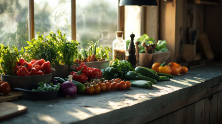 A beautiful kitchen countertop displaying freshly picked vegetables from the garden, including lettuce, radishes, and green beans, ready for meal preparation.