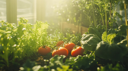 Tomatoes, cucumbers, and peppers thrive in a well-lit greenhouse filled with lush green foliage.