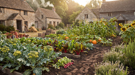 Rustic countryside vegetable garden with thriving autumn harvest, stone cottages, leafy greens, pumpkins and blooming sunflowers.