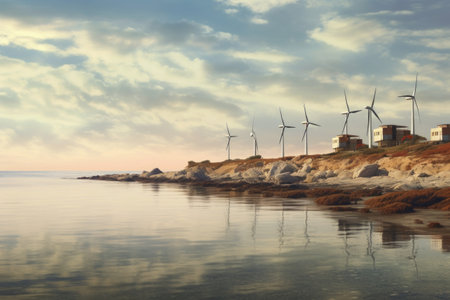 Windmill farm on the ocean shore, windmills on a sunny day. Generative AI