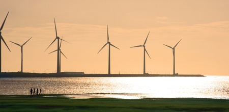 Gaomei Wetlands Area wind turbines in sunset time, a flat land which spans over 300 hectares, also a popular scenic spots in Qingshui District, Taichung City, Taiwan