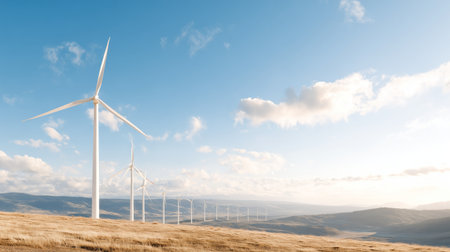 A serene landscape featuring multiple wind turbines standing tall on a grassy hillside under a clear blue sky.