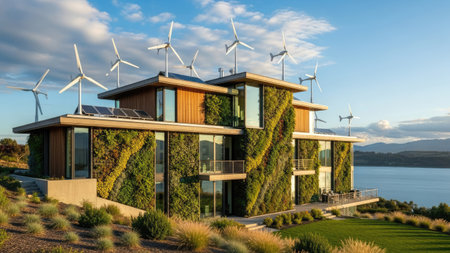 An eco-friendly house features wind turbines and solar panels, integrating with its natural surroundings. The building showcases vertical gardens with lush green walls and wooden elements. The architecture utilizes natural light with large windows. This image could be utilized for environmental and architectural publications.