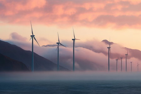 Wind turbines stand tall against a gentle sunrise, surrounded by soft mist and a calming landscape.