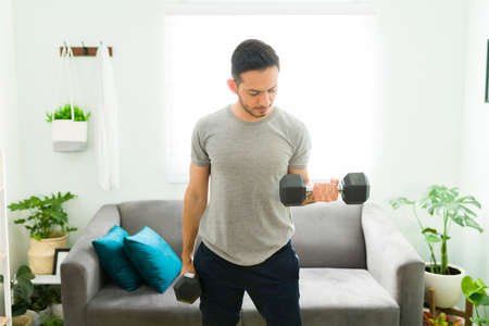 Good-looking man doing a bicep curl in the living room. Sporty man working out with weights to stay healthy and fit