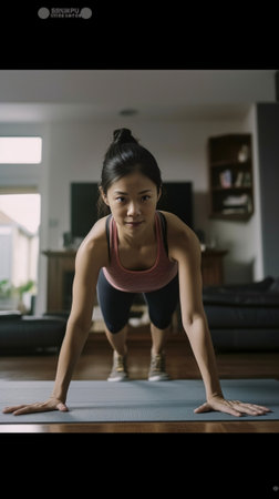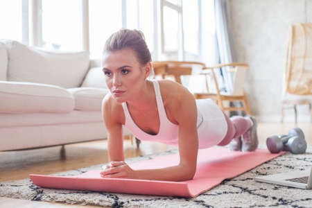 Young healthy active woman training and doing plank at home