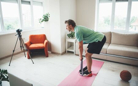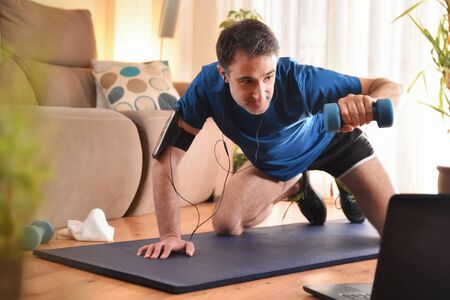 handsome man training at home with laptop
