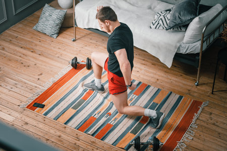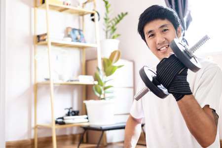 Asian caucasian man hold dumbbell in home training exercise bodyweight trainer indoors workout sport exercise healthy active bodyweight fitness lifestyle