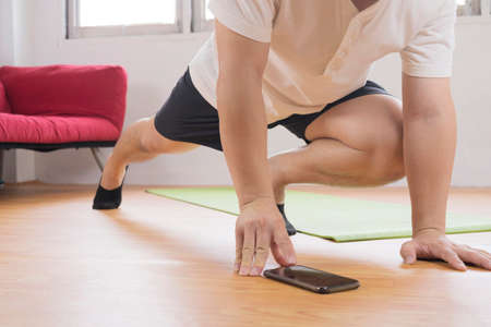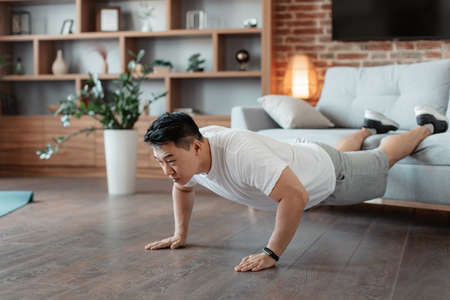 Asian attractive active young man doing floor exercise in living room. Handsome male in sport cloth spend leisure activity time for exercise workout in vacation at home. Healthy lifestyle concept.