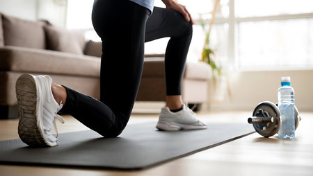 Low section of sportswoman stretching leg while standing on mat at home