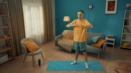 Sports at home. A man in sportswear and with a green headband is warming up in the living room. The man holds his arms bent at the elbows in front of him at chest level. Home fitness concept.