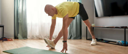 Sportive bald man looking focused while stretching his body, training in living room at home on a daytime