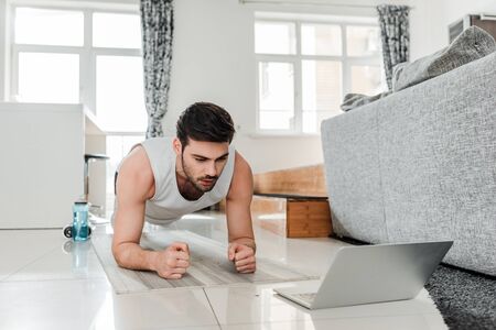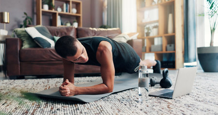 Fitness, laptop and man in home for workout, exercise and training for muscle strength on website. Sports, house and person with computer for online tutorial or video for push up, plank and balance