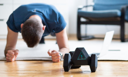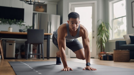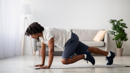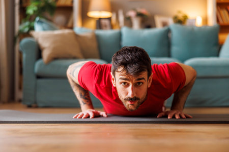 Athletic Young Man Engaged in Home Workout on Fitness Mat in Modern Living Room