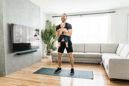 A nice and Happy loving father training with his baby