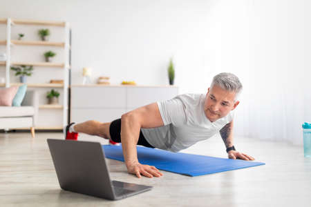 Fit mature man in sportswear doing push-ups, using laptop, having online fitness class from home, copy space