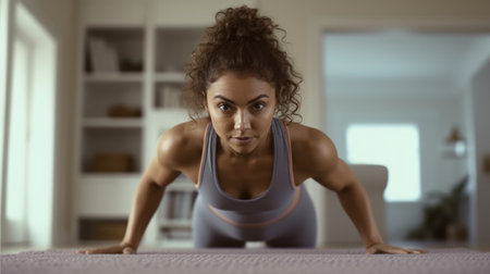 A strong and beautiful sports fitness girls in sportswear doing push ups in their bright and airy bedroom with a minimalistic interior.