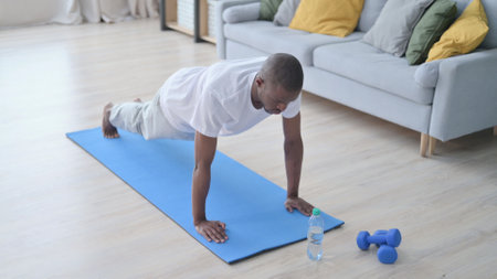 African Man doing Pushups on Yoga Mat at Home
