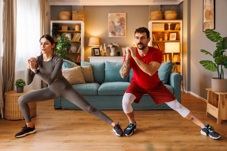Active fit young couple doing bodyweight side lunges exercise while working out together at home