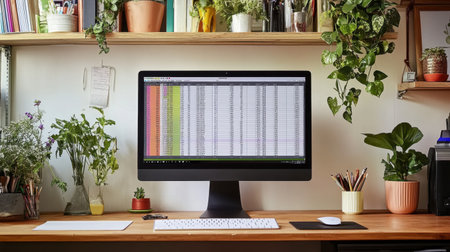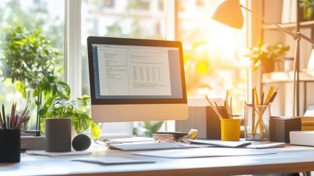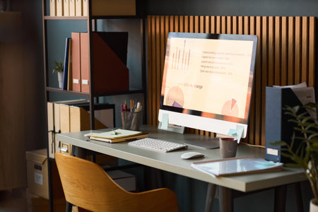 Modern workspace featuring desktop computer displaying business analytics charts and graphs on screen, organized desk with office supplies, shelving unit with folders and documents in background