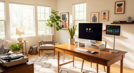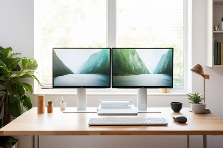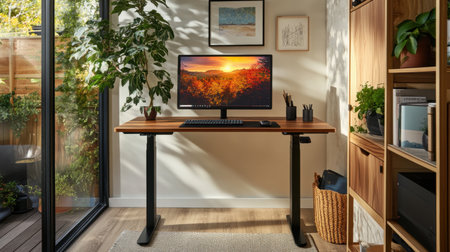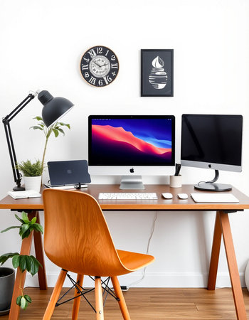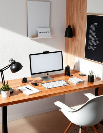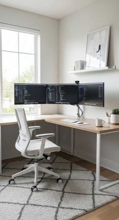 A modern home office with a wooden desk and computer setup in a bright and airy room
