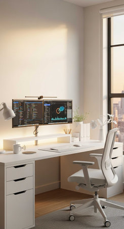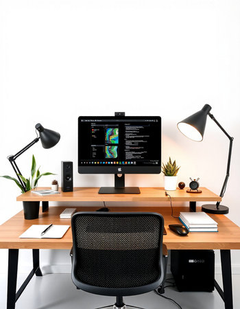 Modern workspace with computer, plant and desk lamp on white background.
