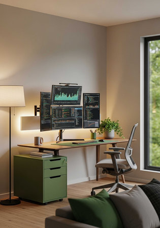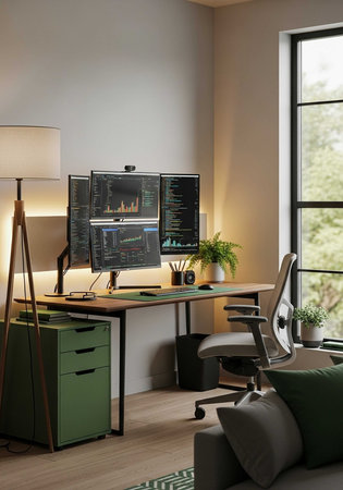 A modern home office with a large desk, computer monitors, and a comfortable chair by the window