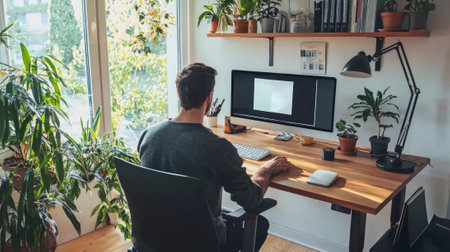Comfortable workplace with computer, houseplant books and office supplies. Blank screen for your advertising text.