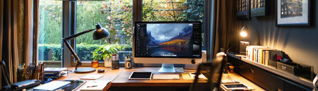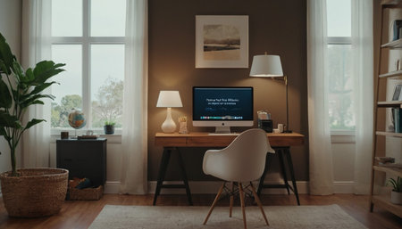 Home working area with office desk set up in living room