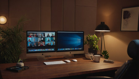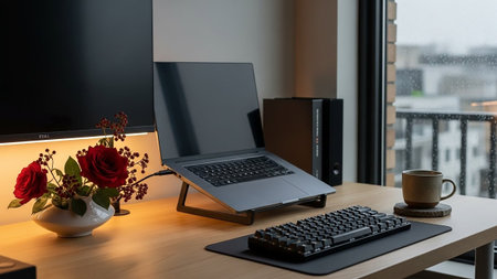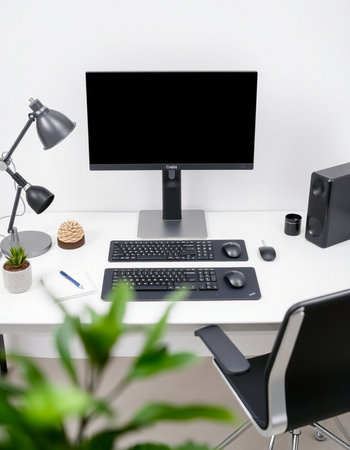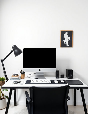 Modern home office with black computer and black desk. Workplace and lifestyle concept