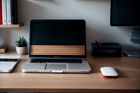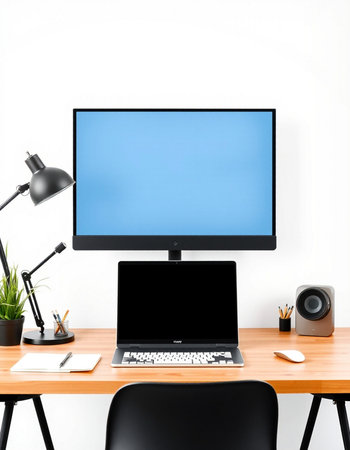 Mock up computer with blank screen at comfortable workplace.