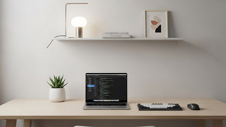 Modern workplace with computer on desk and lamp on white wall, stock photo