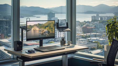 3d illustration of work place in modern office with computer and city view