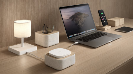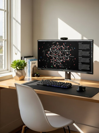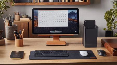 Modern workspace with computer and accessories.