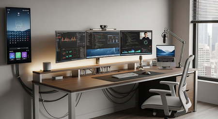 3D Rendering : illustration of a modern workspace with computer monitors and equipment.