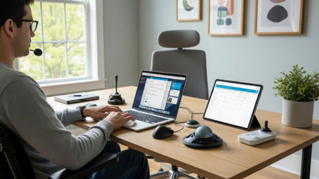 Modern workspace with computer, laptop and mouse.