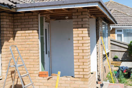 Bricklaying wall in residential property, unfinished front porch with no windows, renovation project, rows of bricks, selective focus