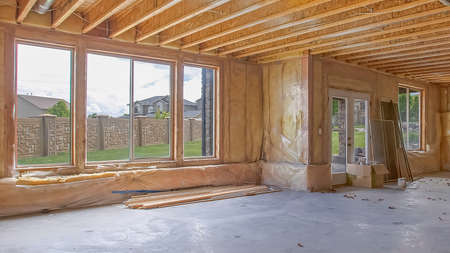 Panorama Unfinished house interior with air conditioning ducts and glass windows and door