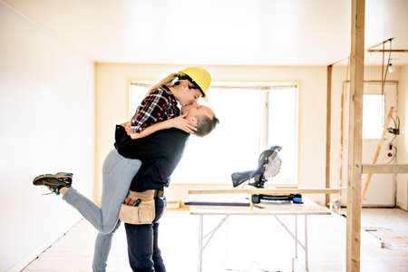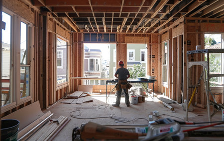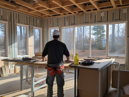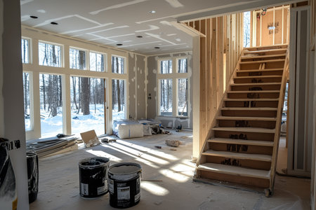 Prepare modern living space during home renovation featuring tools unfinished walls during works day
