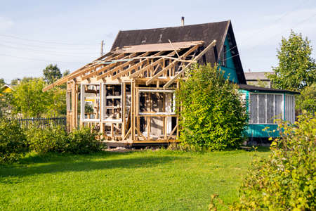 Renovation projects. Building of extension of the existing house, finished brick and block walls, view of unfinished garage inside with wood roof structure, selective focus