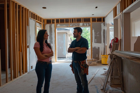 A woman wears casual attire as she engages in conversation with a contractor in a well-lit room undergoing renovations. Drywall and construction tools surround them, indicating progress.