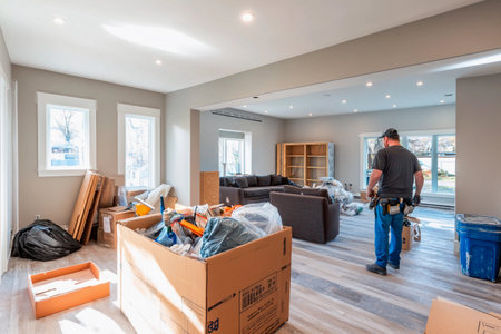 A man is tidying up a newly renovated living room filled with boxes and furniture. The bright space boasts light colors and large windows, lending an airy feel to the environment.
