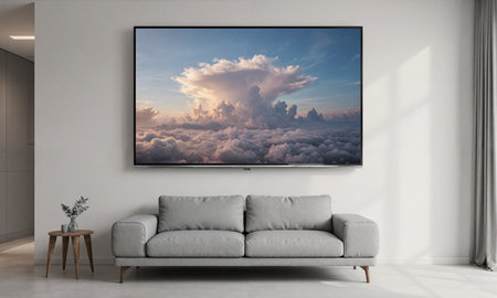 Digital Canvas Wall. An innovative living room featuring a seamless, wall-sized digital canvas displaying a slowly moving, hyper-realistic video