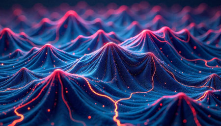 Abstract digital landscape with flowing neon lines and points