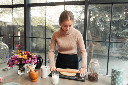 Young woman roll out dough in kitchen. Attractive housewife preparing pie or cookies. Culinary classes, pastry cooking, homemade cuisine concept