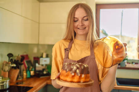 Professional confident woman is preparing custard cakes at light modern kitchen at home