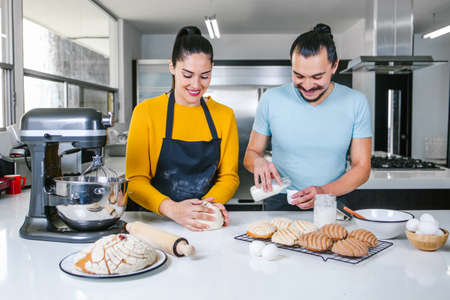 latin couple bakers preparing dough for baking mexican bread called Conchas in kitchen in Mexico city