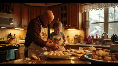 A father and his two young daughters enjoy a heartwarming baking session in a bright, sunlit kitchen. They are making homemade cookies, surrounded by ingredients and colorful cookie cutters, celebrati