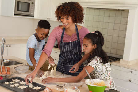 Happy african american mother with son and daughter baking in kitchen, cutting cookies. family enjoying quality free time together.