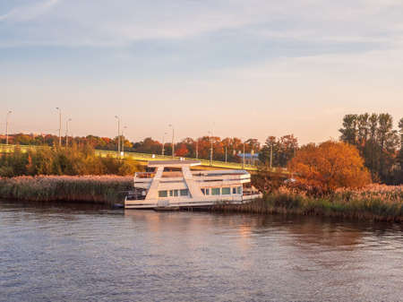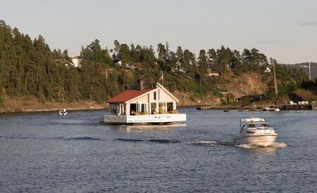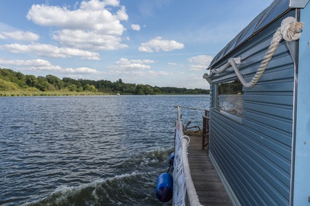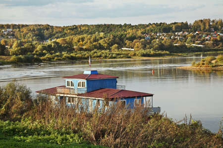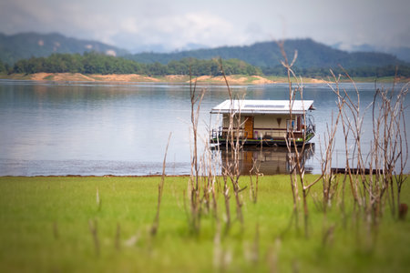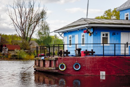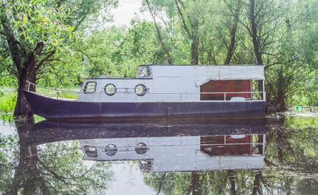 Boat and houseboat with reflection in water on calm morning lake, Natute background